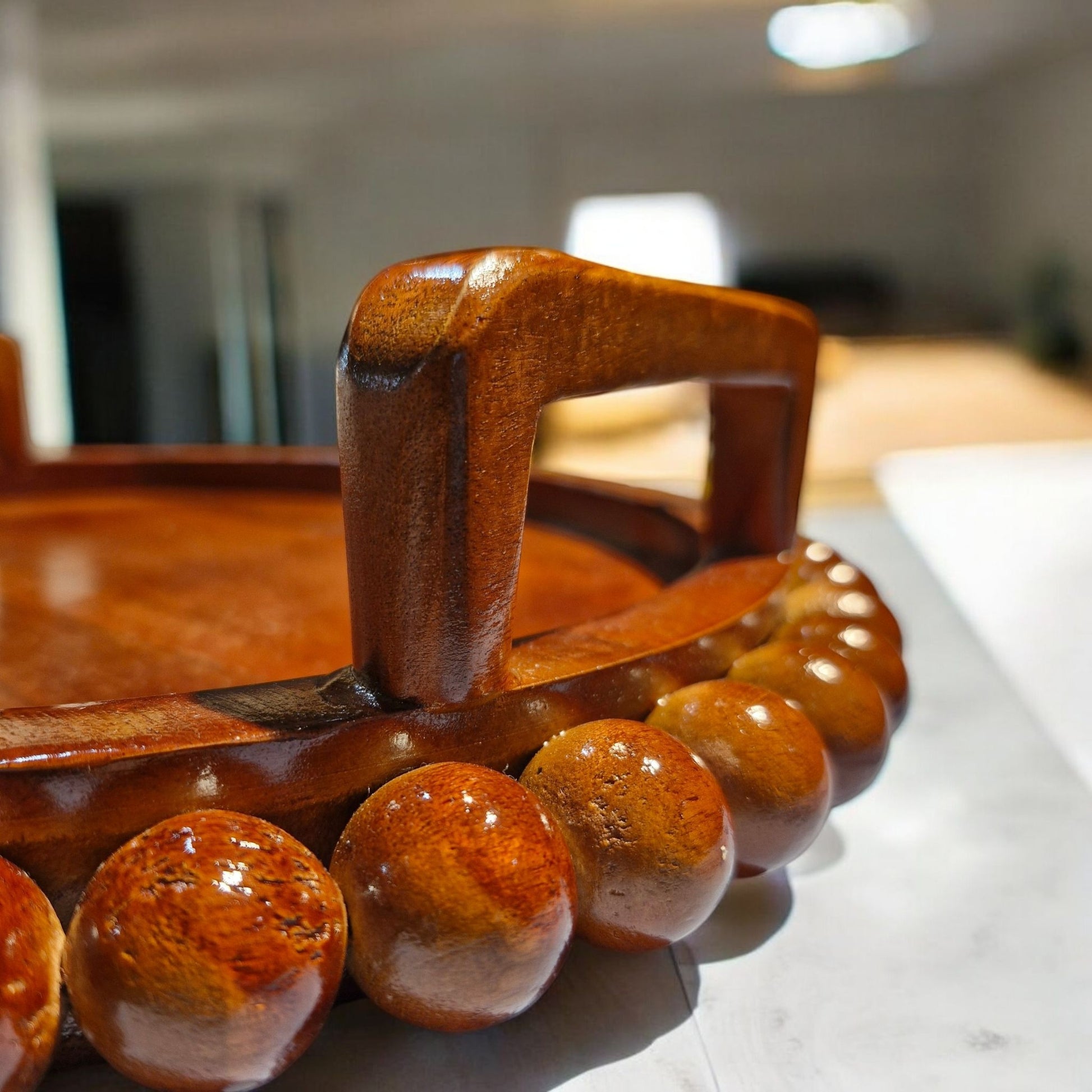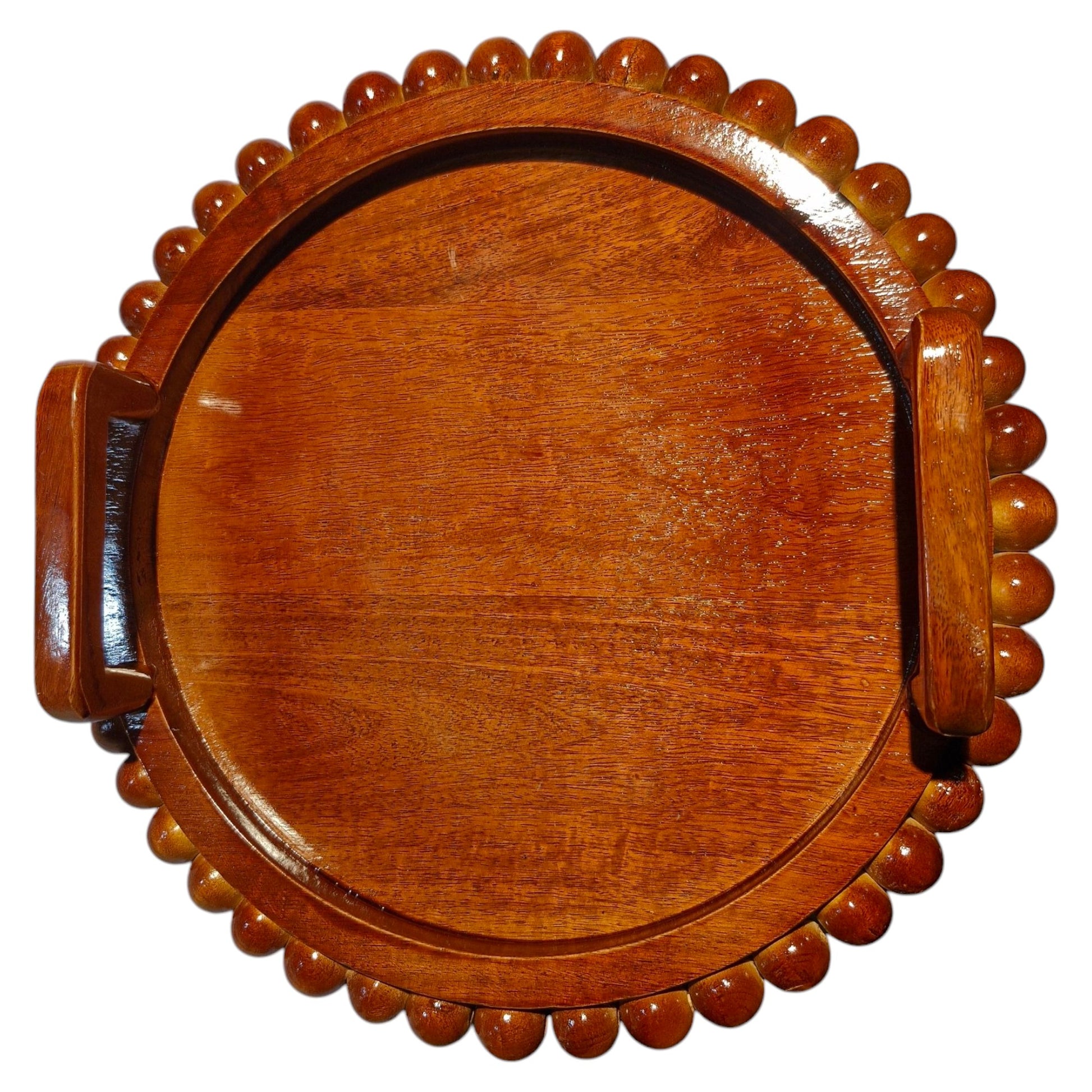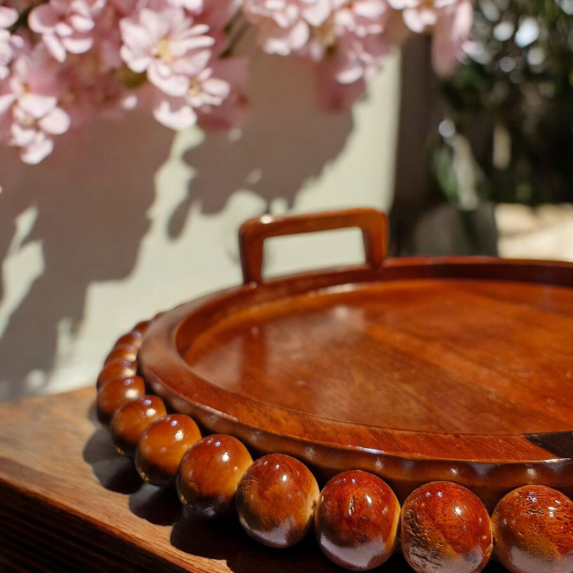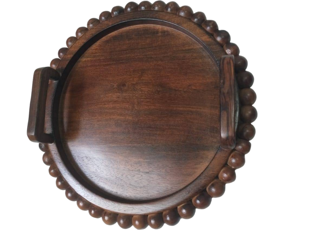 The tray's blend of wood tones and beads creates a rustic yet chic aesthetic, blending seamlessly into various décor themes. Its solid construction ensures durability and stability, making it suitable for both decorative and functional purposes. With a smooth surface that's easy to clean, this tray is practical for everyday use, enhancing both the style and functionality of your living space.