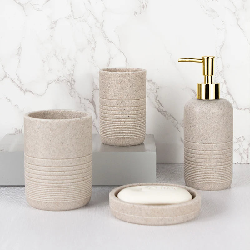 Earthly Elegance sandstone resin tray soap dispenser bathroom accessory beige