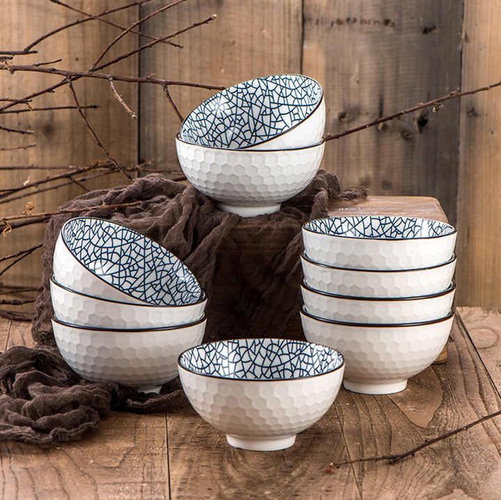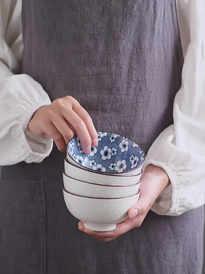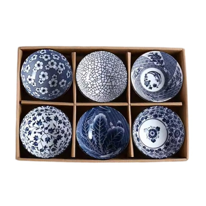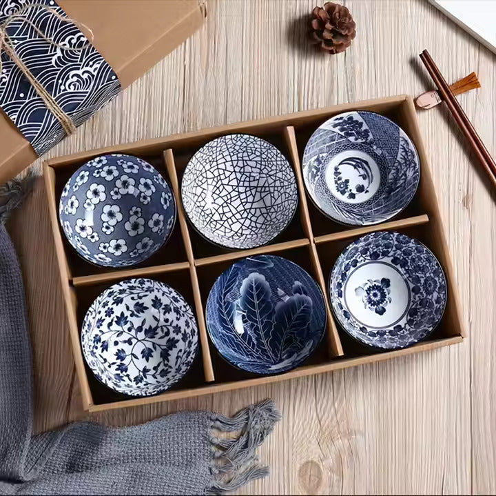Japanese colored hand painted white and blue porcelain ceramic food breakfast rice soup noodle ramen bowl chopsticks Gift sets of 6