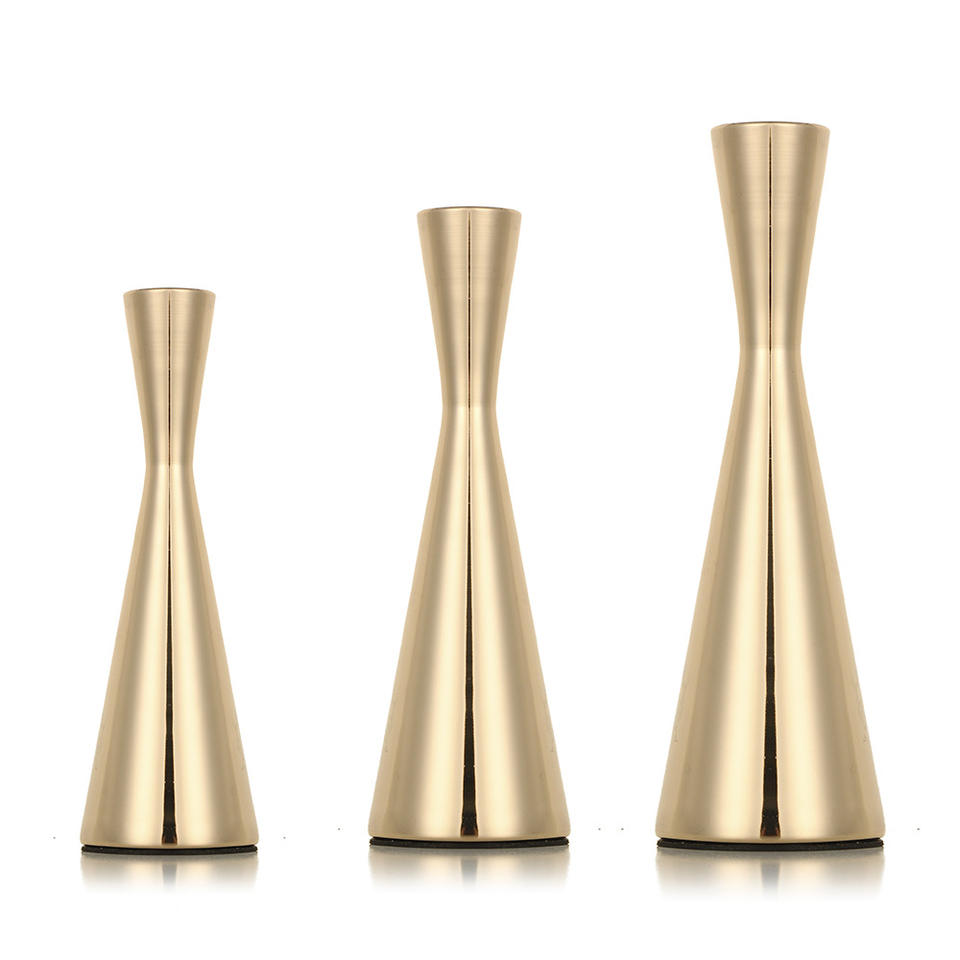 - The Luxury Flolenco Home Décor Accessories Set of 3 Metal Candlestick Holders offers a touch of sophistication and elegance, making them ideal for weddings, special events, or as a stylish addition to any home décor. These modern gold candlestick holders create an upscale atmosphere with their sleek design and luxurious finish, perfect for complementing a variety of event themes or modern interiors.