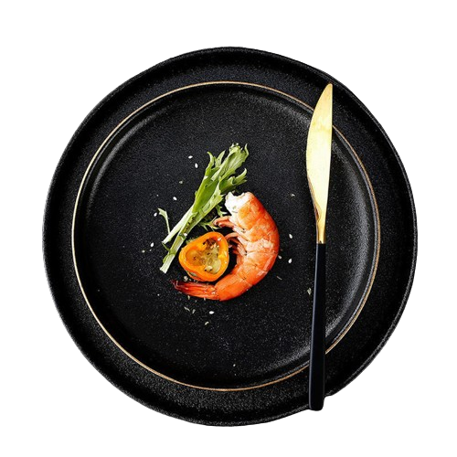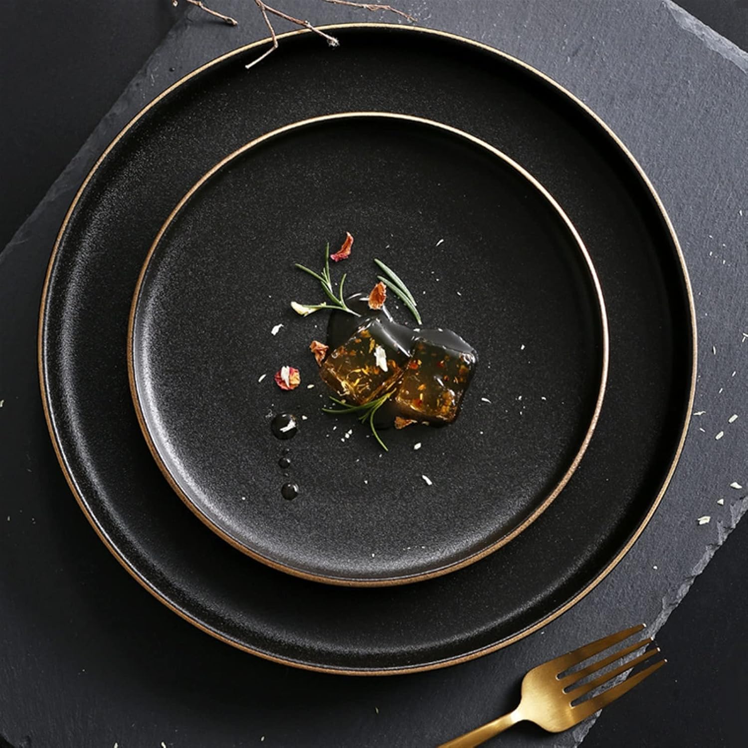 - Elevate your dining experience with this sophisticated 8-inch frosted black plate featuring a luxurious gold rim. Crafted from high-quality ceramic, this plate combines durability with modern elegance, making it perfect for both casual meals and formal gatherings. The matte black surface with a refined gold trim adds a touch of luxury, effortlessly enhancing any table setting.