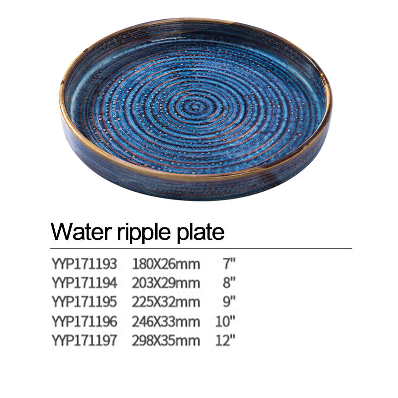- Add a touch of artistic elegance to your dining table with this 7-inch Blue Flambe Water Ripple Plate. Featuring a unique water ripple design and a striking blue flambe glaze, this plate serves as both a functional and decorative piece for your tableware collection. Perfectly sized for serving small appetizers, salads, or desserts, it brings a sense of sophistication and visual appeal to any dining occasion, whether you're hosting a formal dinner or enjoying a casual meal with loved ones. The rich blue color, combined with the distinctive ripple texture, makes this plate a standout item that will impress your guests and enhance your table setting