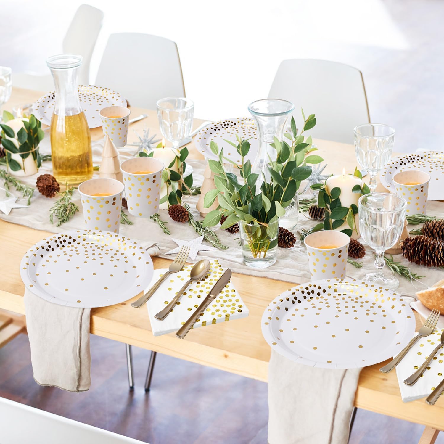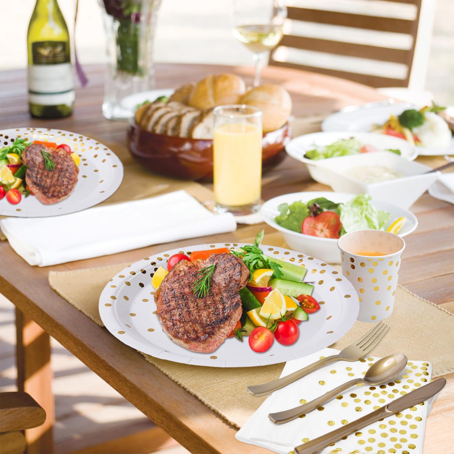 - Set Includes: 100-piece set with 9-inch (23 cm) dinner plates, 7-inch (18 cm) dessert plates, and 3-ply napkins
