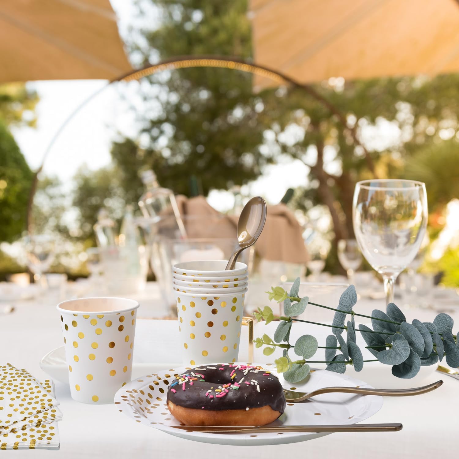 - Elevate your event with this Black and Gold Paper Plates and Napkins Set, designed to bring elegance and convenience to any celebration. This 100-piece set includes sturdy 9-inch and 7-inch plates with a sleek black background and eye-catching gold accents, paired with ultra-absorbent 3-ply napkins. Whether for birthdays, weddings, baby showers, or formal gatherings, this disposable dinnerware set adds a sophisticated touch to your table décor.