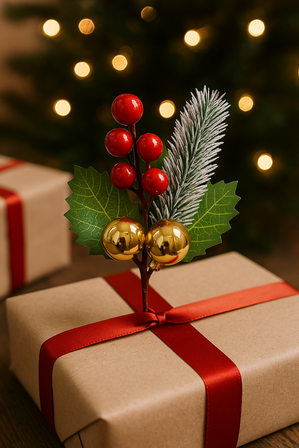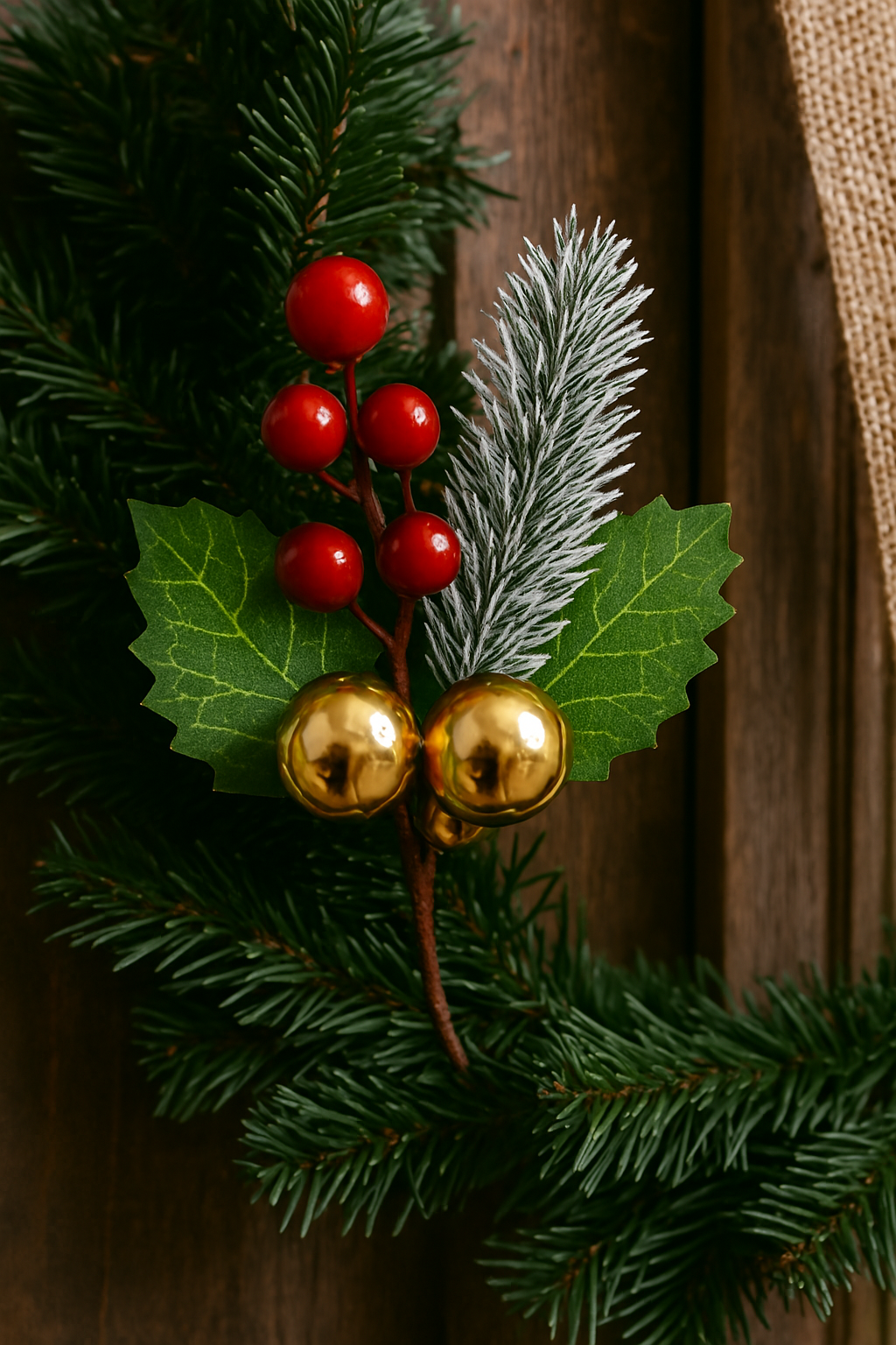 - Crafted from high-quality artificial berries, baubles, and foliage, this pick is designed for long-lasting beauty without fading or wilting. The striking contrast of bright red berries against the shimmering gold baubles makes it an eye-catching addition to both traditional and modern holiday themes. Its sturdy yet flexible stem allows for effortless styling, making it perfect for DIY projects and creative arrangements.